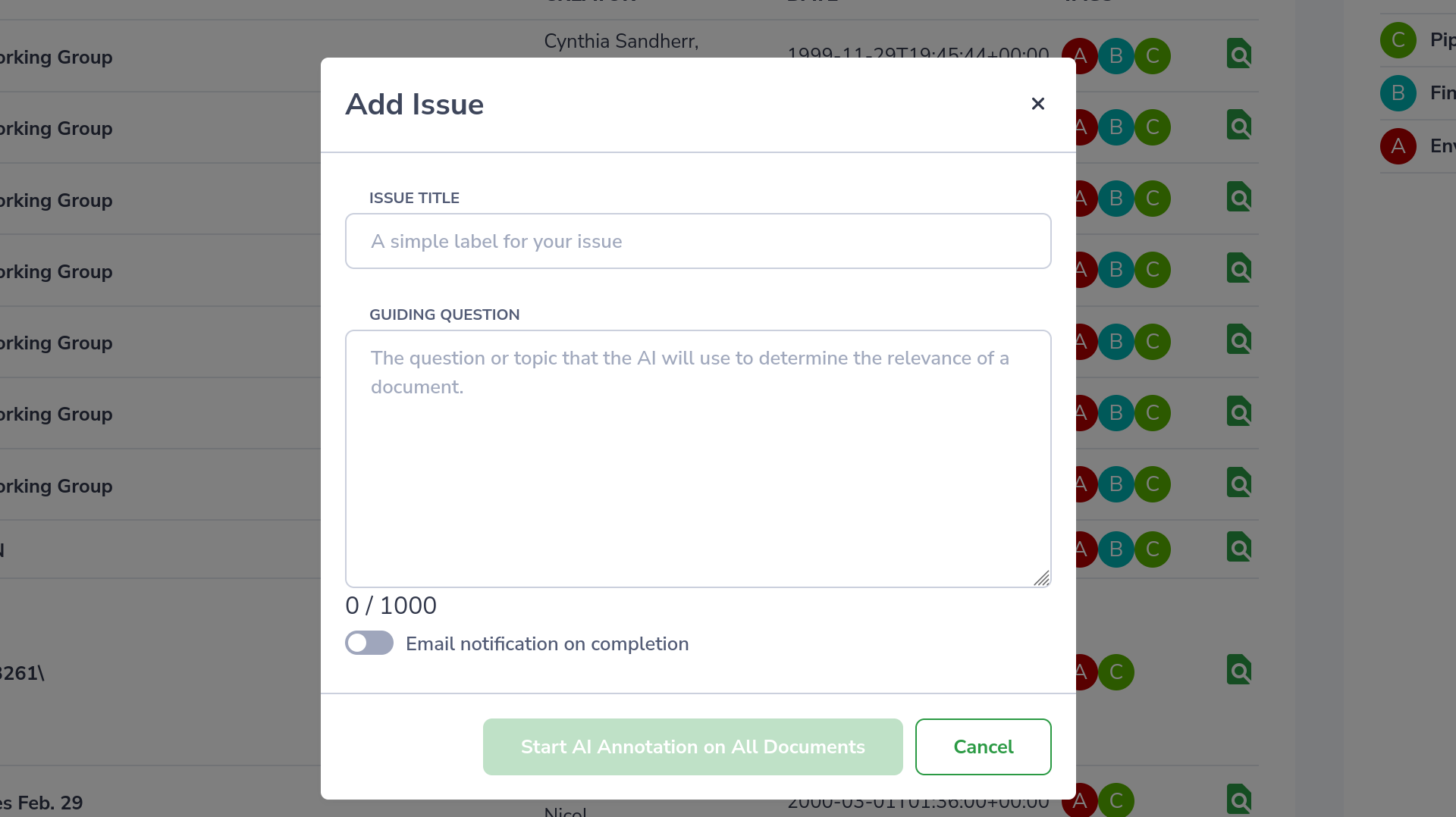 Just copy and paste the guiding questions from your review protocol and Discernis will go through every document to assess its responsiveness.